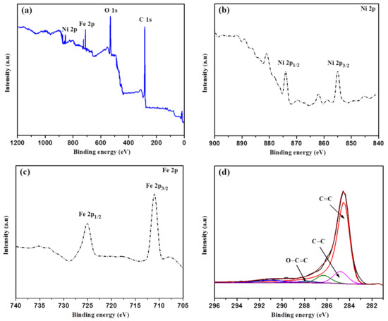 XPS analysis of the S5% Fe-Ni sample: (a) Survey scan; (b) Ni 2p spectra; (c) Fe 2p spectra; and (d) Deconvoluted XPS spectra of the C 1s region.