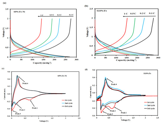 Electrochemical performances of the FLG materials: (a,b) GCD curves of the S5% Fe-Ni and S10% Fe samples at rates of 0.1 to 1 C; (c,d) CV curves of the S5% Fe-Ni and S10% Fe samples at a scan rate of 0.1 mVs−1.