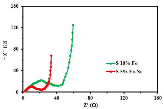 The Nyquist plots of the S5% Fe-Ni and S10% Fe samples.