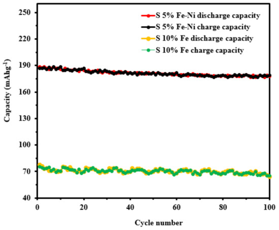 Cycling stability of the S5% Fe-Ni and S10% Fe samples at the current rate of 1 C.