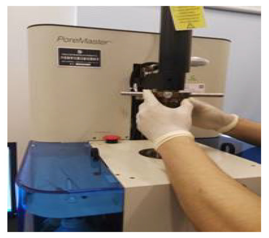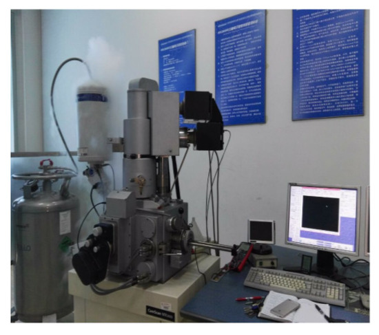 A scanning electron spectrometer was used as shown in Figure 2. A high-performance automatic mercury injection instrument was used, as shown in Figure 3. The rock samples were dried and put into the core chamber of the automatic mercury injection instrument. The injection pressure was increased. When it became stable, the pressure and volume of the mercury injected were recorded. The capillary pressure curve, the porosity, the pore volume, and the pore size distribution curve could be obtained by constantly changing the mercury injection pressure. At the same temperature measurement point, three granite samples were taken for mercury injection testing, and the average value or a typical image of the test results were taken.