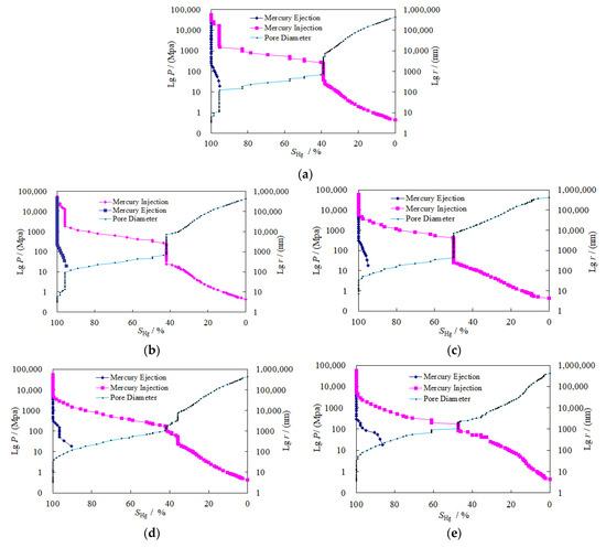 The experimental data obtained from the mercury injection test are shown in Table 1.The capillary pressure curve reflects the development of the pores and throats and the connectivity between the pores. The resulting capillary pressure curve and pore diameter curve of granite are shown in Figure 5.