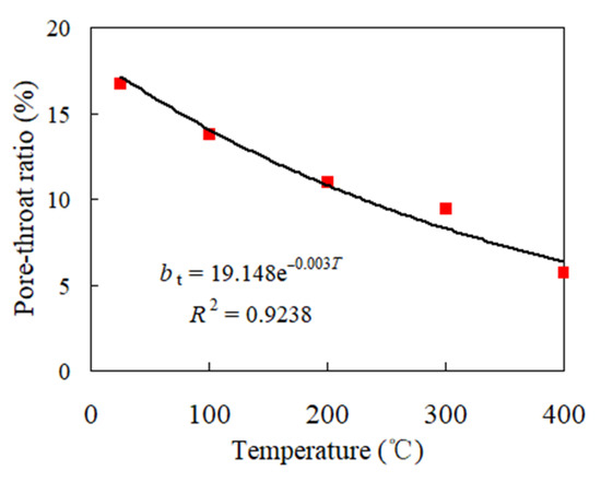 The pore–throat ratio is one of the key parameters for evaluating geothermal mining projects. Under different thermal actions, the pore–throat ratio of granite was determined by reference to Reference [28]. At 25 °C, 100 °C, 200 °C, 300 °C, and 400 °C, the pore–throat ratio of granite was 16.71, 13.77, 10.99, 9.46, and 5.76, respectively. On this basis, the curve of the changes in the pore–throat ratio with the temperature can be obtained, as shown in Figure 6. From 25 °C to 400 °C, the pore–throat ratio of granite gradually decreased, and the fitting function between the pore–throat ratio () and the temperature () is as follows: