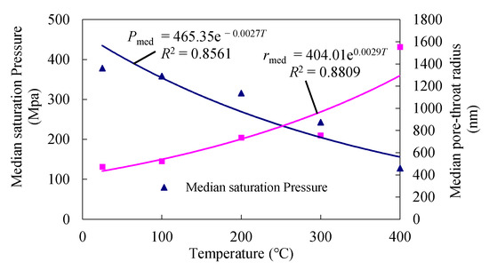 The median saturation pressure is the mercury injection pressure value (Figure 5) when mercury injection saturation reaches 50%. The median pore–throat radius is the radius of granite when the mercury injection saturation reaches 50%. From 25 °C to 400 °C, the median saturation pressure and median pore–throat radius at mercury saturation of granite are shown in Table 1. The curves of change in the median saturation pressure and median pore–throat radius with temperature are shown in Figure 7.
