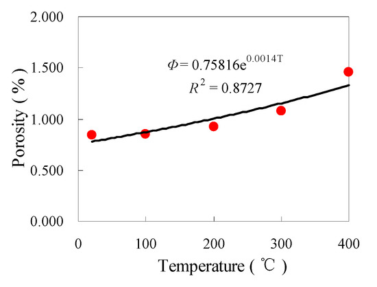 As can be seen from Table 2, the measurement error of porosity is small and the measurement results are accurate. The curve of change in the porosity with temperature is shown in Figure 8. The porosity of granite increased as the temperature rose, which is consistent with previous findings [20,26]. The changes in the porosity (Φ) with temperature () can be expressed by an exponential function, as follows