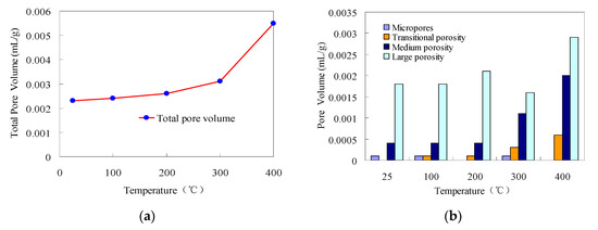 According to Table 3 and Figure 9b, the pore volumes of the macropores, mesopores, transitional pores, and micropores inside granite varied slightly with the temperature. At 25 °C, 100 °C, and 200 °C, the pore volumes of the mesopores, transitional pores, and micropores changed insignificantly as the temperature increased, while the pore volume of the macropores and the total pore volume slowly increased as the temperature rose. At 300 °C and 400 °C, the volumes of the macropores, mesopores, and transitional pores and the total pore volume increased as the temperature rose. In particular, the pore volumes of the transitional pores and the mesopores showed the most prominent increasing trend, and the increasing gradient was great.
