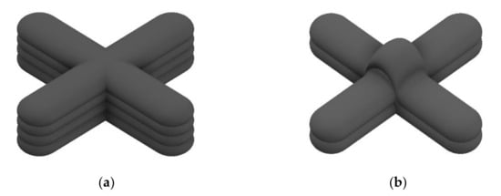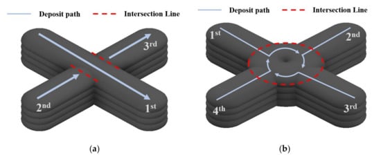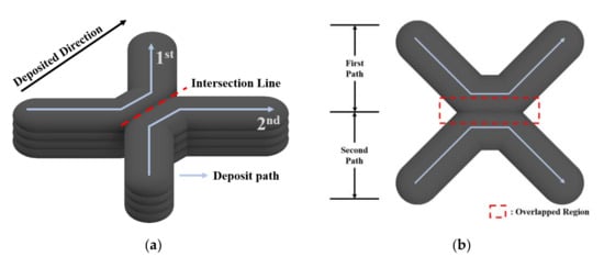 Designs of intersection parts: (a) ideal model of deposition products with intersection paths, (b) deposit failure that occurs when the deposition process neglects the overlap of the bead by the manufacturing characteristics.