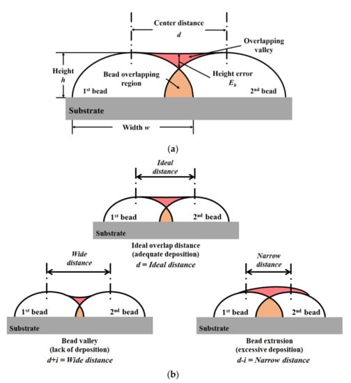 Figure 3 shows the multi-path overlapping of the bead model following the center distance. Figure 3a shows the overlapping bead model, in which the bead has a height error by an interval of the bead. Figure 3b shows the case of the bead overlap model considering the height error. The center distance (d) imposes an effective condition on the height error occurring in the path planning. At the ideal center distance, the height error was almost nonexistent. If the center distance was wide, the small overlapping area caused a height error, and a bead valley was formed. When the center distance was narrow, a height error occurred because of excessive molten metal. Therefore, the ideal d-value was set before the experiments.