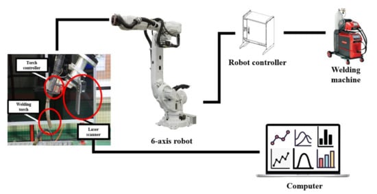 WAAM experiments were performed using the system shown in Figure 5. The 3D line laser scanner (Keyence GmbH., Osaka, Japan) was combined with a torch head to perform the experiments. A computer was used to analyze and collect data on the deposition bead width and height. The 6-axis robot arm (IRB 6700 of ABB Ltd., Zurich, Switzerland) was used to control the motion of the robot with a programmed path and welding process. A welding machine (TPS 500i of Fronius co., Ltd., Pettenbach, Austria) for the metal inert gas welding (MIG) was used for the controlled arc welding process. A laser scanner was used to measure the width and height of the deposited beads. The hardness measurement was conducted by using a rebound durometer (HH-411 of Mitutoyo, Kawasaki, Japan) to obey the experimental conditions of the equipment. Measurements were made 15 times at intervals of 3 mm at a distance of 5 mm from the edge of the specimen.