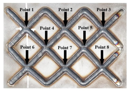 Figure 7 shows the results of the single-layer deposition experiment with the intersection path. The path was designed to generate many intersections, while the height of the intersection from points one to eight was measured using a laser scanner. Figure 8 shows the height value of the single-layer experiment at each point. From the results of the single-layer experiment, the average height of the intersection was 3.6089 mm, while the difference between the maximum and minimum heights was 0.455 mm. The error occurred at a magnitude of 1.2% compared to the maximum bead height. Therefore, the single-layer experiment was conducted under a stable deposition.