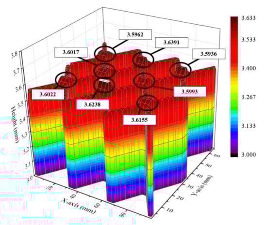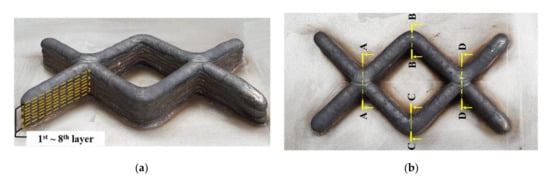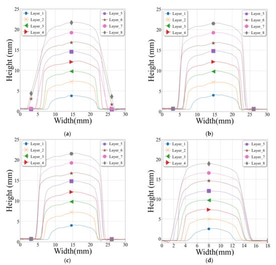 Figure 10 shows the results of the multi-layer experiment. An eight-layer deposition was stably performed. To verify that the suggested deposition path is free from defects during deposition, height data is collected at four sections, as shown in Figure 10b. Table 2 represents the heights, maximum height difference, and height error rates between the intersections and non-intersections of each layer. The height error rate of each layer was in order to express the height error decrease. The heat was accumulated to each layer during deposition by the heat input and the short cooling time. In the intersections, the heights were 3.5162 mm and 3.7089 mm at the first layer, 6.9075 mm and 6.8437 mm at the second layers, 9.3539 mm and 9.7571 mm at the third layers, 11.8979 mm and 11.7252 mm at the fourth layers, 14.1387 mm and 14.3892 mm at the fifth layers, 16.8256 mm and 16.4218 mm at the sixth layers, 18.8024 mm and 18.8084 mm at the seventh layers, 21.5143 mm and 21.3413 mm at the eighth layers. Moreover, the height errors were 5.2%, 0.9%, 4.2%, 1.4%, 1.7%, 2.4%, 0.03%, and 0.8%, respectively. In the non-intersections, the heights were 3.1573 mm and 3.1573 mm at the first layer, 5.7199 mm and 5.6253 mm at the second layers, 8.0564 mm and 7.9470 mm at the third layers, 10.2608 mm and 10.2608 mm at the fourth layers, 12.8170 mm and 12.7691 mm at the fifth layers, 15.5963 mm and 15.3227 mm at the sixth layers, 17.5123 mm and 17.5016 mm at the seventh layers, 19.7510 mm and 19.7510 mm at the eighth layers. Moreover, the height errors were at 0%, 1.6%, 1.3%, 0%, 0.3%, 1.7%, 0.06%, and 0%, respectively. The height error rate at the intersection was 0.8% at the maximum layer, while the height error in the non-intersection was absent at the maximum layer. This represents negligible height error if surface post-processing is performed to remove irregularities on the top of the deposited product after deposition.