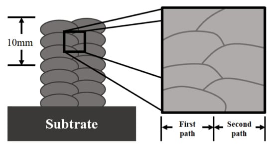 The experiment was performed using a 304-stainless steel wire (diameter: 1.2 mm). Moreover, the dimensions of substrate were 200 mm × 125 mm × 25 mm. To reduce the heat input of component manufacturing using the cold metal transfer (CMT) mode, a shielding gas was used (99.95% pure argon at a flow rate of 20 . The wire travel speed was set at 5.1 m/min and the travel speed was 5 mm/s. The voltage was set to 120 V depending on the wire feed rate. The deposition parameters used to test the suggested path planning are listed in Table 1.