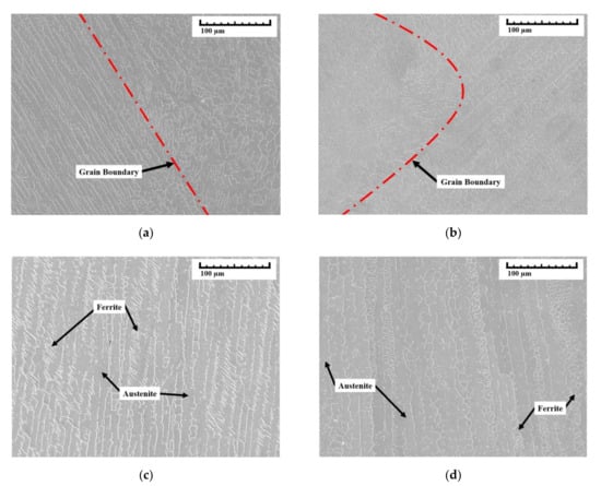The multi-layer experiment was performed at the centers of the substrate with eight layers of deposition using the suggested path planning. The microstructure between each layer was analyzed using scanning electron microscopy (SEM). Surface polishing was performed before the SEM measurement, and surface roughness was measured using Portable roughness tester (SJ-210 of Mitutoyo, Kawasaki, Japan). Through three repeated measurements for each specimen, accuracy was improved. The measured average surface roughness of specimens was 0.060~0.083 µm. Figure 12 shows a schematic diagram of component analysis by SEM. The overlapping of beads occurred in sections A-A and D-D, but the shape of the grain boundary was different depending on the measured location. A more detailed analysis of the microstructure of the deposited bead is presented using the SEM image shown in Figure 13. The SEM image of the specimens showed the presence of the ferrite and austenite phases. Figure 13a,b, the SEM images of sections A-A and D-D, show the grain boundaries that appear owing to the overlapping of beads in paths in the components. The cross-sectional views B-B and C-C are shown in Figure 13c,d. The substrate and wire of 304-stainless steel are observed to be perfectly deposited without altering the microstructure of each layer. The SEM image results demonstrate the absence of porosity; however, grain boundaries occurred at the overlapped intersection.