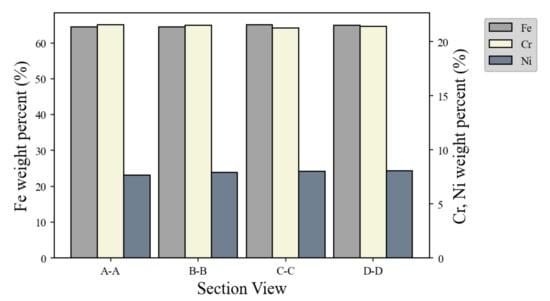 Figure 14 shows the results of the analysis of the material components of the specimens at each section. The analysis found that at the intersection, the proportions of Fe, Cr, and Ni were 64.69 wt.%, 21.51 wt.%, and 7.83 wt.%, respectively. At the non-intersection part, the proportions of Fe, Cr, and Ni were 64.8 wt.%, 21.39 wt.%, and 7.96 wt.%, respectively. The intersections had lower mass ratios of Fe and Ni and greater mass ratios of Cr than the non-intersection parts. According to the component analysis, the differences in properties owing to bead overlap between the intersection and non-intersection parts were negligible.