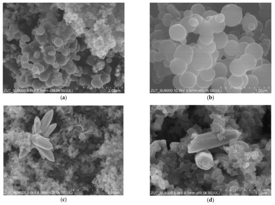 Figure 2c,d). Larger spheres with diameters up to 2000 nm appeared. More impurities and inclusions were observed on the surfaces of the carbon spheres. Furthermore, the merging of carbon spheres was noticed. According to [