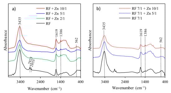 42]. All samples after modification with zinc nitrate generally presented similar patterns to RF materials. No changes after modification were observed. This phenomenon is related to a very similar procedure of sample preparation.