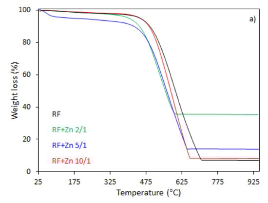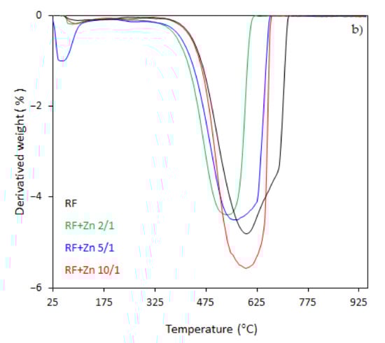 43]. It should be noticed that with the increased degree of coalification of the initial material, the temperature shifted towards lower values. The samples modified with different amount of zinc nitrate exhibited less weight loss within the range of temperature of 328–670 °C and 321–650 °C, corresponding to the DTG profile centered at 600 and 570 °C for the samples RF + Zn 10/1 and RF + Zn 5/1, respectively. The total weight loss for the sample RF + Zn 10/1 was 92%, which decreased to ca. 86% for the RF + Zn 5/1 sample, whereas the DTG profile for the RF + Zn 2/1 (sample synthesized at a highest zinc nitrate ratio) showed a beginning of the thermal decomposition process at 269 °C and ending at 620 °C, reaching the maximum value at 530 °C, while the total weight loss was 65%. According to the thermogravimetric (TG) study, the weight loss decreased with the increasing ZnO content in the composites (confirmed by XRD).