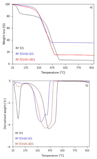 Figure 8a,b. The activated samples had a lower initial combustion temperature than the non-activated samples. The total weight loss for the sample RF7/1 was 94%, which was accompanied by a broad mass loss peak in the DTG profile. Decomposition occurred in the range of 160–570 °C, reaching the maximum rate of decomposition at 460 °C (DTG profile). The initial decomposition temperature was about 180 °C lower then initial decomposition temperature for RF sample. The total weight loss for the sample RF7/1 + Zn 10/1 was 86%, whereas for the samples RF7/1 + Zn 5/1 the losses reached 65%. The residuals were about 6.5% and 25.6%, respectively, smaller than to total weight losses for the non-activated carbon spheres.