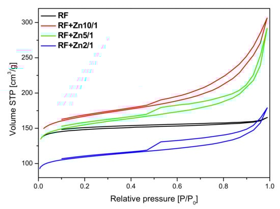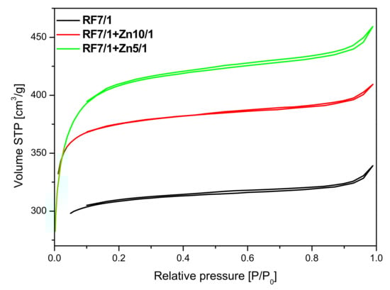 Figure 9. For the unmodified RF sample, an isotherm of type I according to the IUPAC classification, characteristic for the microporous materials was obtained. Modification of the carbon material with Zn(NO