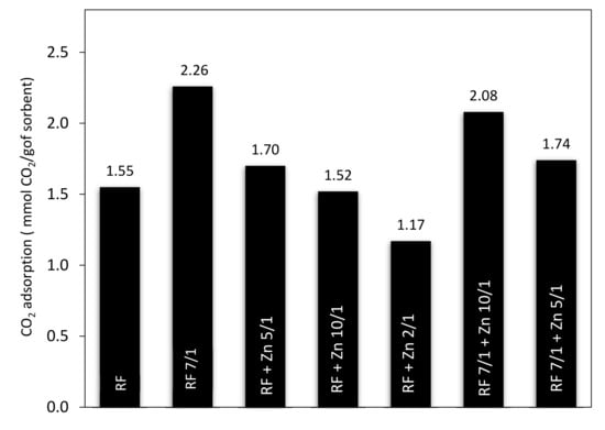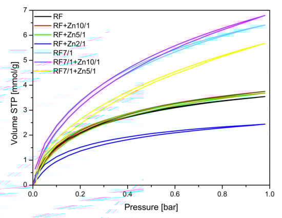 For the RF7/1 + Zn10/1 sample, a slight increase in CO2 adsorption compared to the RF7/1 reference material was noticed, probably due to the higher contribution of pores of 0.35 nm in diameter, which were not observed in the RF7/1 reference material.