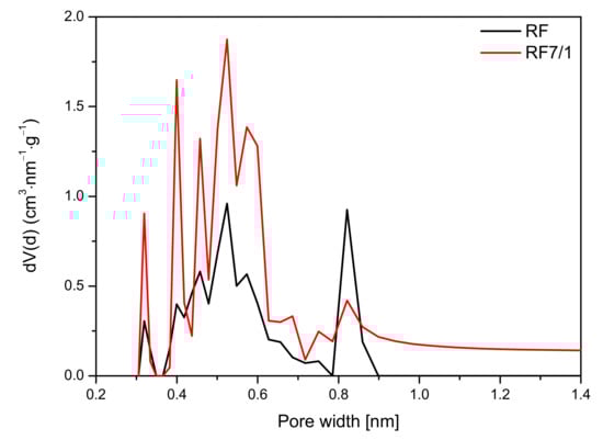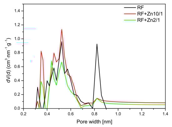 49]. For RF + Zn10/1, the contribution of the same pores was lower. However, pores of 0.35 nm size appeared. Moreover, for the material RF + Zn10/1, development of the pores in size of 0.55 nm was noticed. This could result in an increase in CO