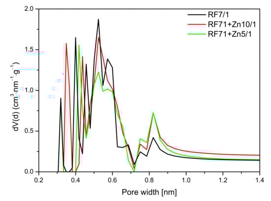 2 adsorption capacity were observed for this material. This was due to the decreased micropore volume in this sample, in favor of mesopores. In addition, it can be seen that, in the RF7/1 + Zn5/1 material, there were pores with a size below 0.35 nm which were not capable adsorbing CO
