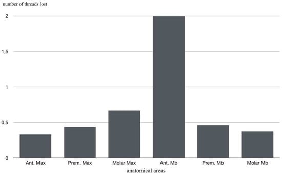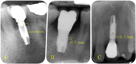 - Marginal Bone Loss (MBL): periapical intraoral radiographs were used to evaluate bone loss around the implants (Sirona Heliodent with 1 mm aluminum filter). A Rinn Endoray® plate holder (Markham, ON, Canada) was used to maintain the same object focus distance for all patients, and to avoid focus distance variations that could lead to inaccurate results. The distance between the bone crest and the implant shoulder on both mesial and distal aspects was measured from periapical radiographs by the same operator in all cases. These measurements were expressed by the number of implant threads lost (Figure 4).