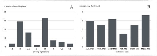 - Probing Depth (PD): a periodontal probe cp-15 (Hu-Friedy®, Chicago, IL, USA), calibrated at intervals of 1 mm, was used to evaluate peri-implant mucosa behavior (Figure 3). PDs of 0–6 mm were considered physiological, and, when >6 mm, as pathological. Three points on vestibular and lingual/palatal aspects were evaluated for each implant;
