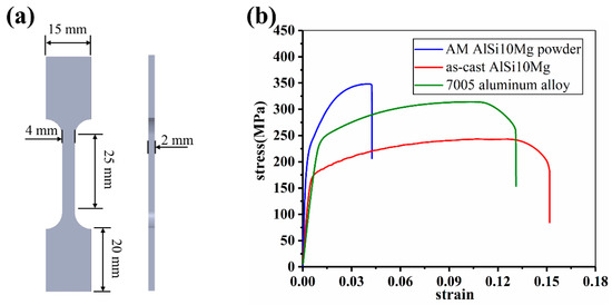To know the mechanical properties of different aluminum alloys used in the present study, the tensile experiments were carried out. The geometric dimensions of samples used for the tensile test are shown in Figure 1a. The tensile rate is set to 2 mm/min, and a laser extensometer is used to characterize the strain. Each type of sample is tested three times, and the arithmetic mean value is taken as the representative value. The stress–strain curves of related alloys are shown in Figure 1b. Among the three alloys, the AM AlSi10Mg alloy has the highest strength and stiffness, but the lowest ductility. On the contrary, the as-cast AlSi10Mg alloy shows the highest ductility but the lowest strength. The 7005 aluminum alloy exhibits moderate strength and ductility, just between the other two.
