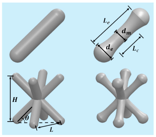 The mechanical properties of the lattice structure can be improved through node-enhancement [21,22]. In this study, the effect of preparation method and strut materials are the focus of attention. An enhanced pyramidal (EP) lattice structure and a usual one are shown in Figure 2. It is clear that the enhancement is realized simply by gradually increasing the diameter of struts toward the node.