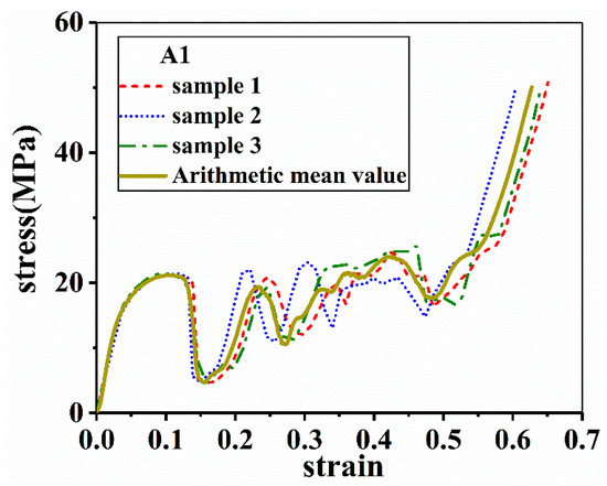 At the largest included angle, 55°, there was no obvious change in the deformation modes of C1 and C2, compared with that of B1 and B2. However, the deformation and failure characteristics of C3 were completely changed. Cracks were formed at the beginning of compression, and subsequently the structure was completely fractured when the strain was only 0.3, exhibiting a brittle nature, as shown in Figure 5c.