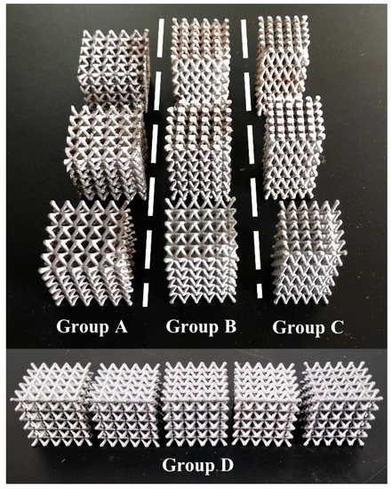Four group samples, A, B, C and D, of node-enhanced pyramidal lattice structures.