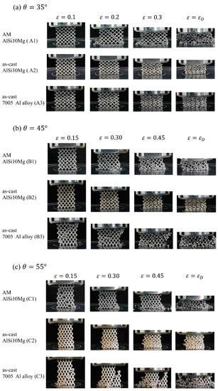 At the smallest included angle, 35°, the samples A2 and A3 show a similar deformation mode. The deformation started from the struts in the middle layer, and then the struts were bent and folded layer by layer with less lateral extension as the compression deformation proceeded until they were all pressed together. The sample A1, however, shows a very different deformation mode. There appeared a diagonal shearing band in the structure at the beginning of deformation. As the compression continued, the struts in the band were broken while those in other areas seemed to keep unchanged. Throughout the whole compression process, the structure was deformed and densified in the form of shearing along the band, leading to obvious lateral extension, as shown in Figure 5a.