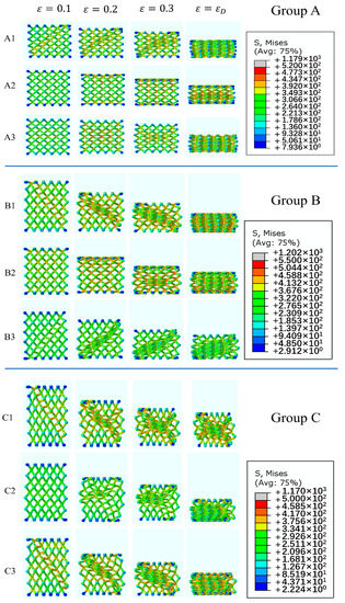 Mises stress distribution diagrams of EP lattice structures in Group A, B and C.