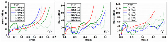 Figure 5 gives the deformation processes of samples in Group A, B and C, in which three different included angles and matrix material states were examined. Figure 6 and Figure 7 present the results of FEA and the corresponding stress–strain curves, respectively.
