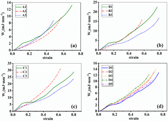 Figure 12 shows the absorbed energy per unit volume Wv against strain of all samples. It is clearly seen that different strut materials and different inclination angles lead to different energy absorption behaviors. When the strut material keeps unchanged but the inclination angle is increased, the energy absorption capacity will be greatly enhanced. For example, sample A1, B1 and C1 have the same strut material but different inclination angles. C1 shows the highest Wv while A1 the lowest because they have the largest and the smallest inclination angle, separately.