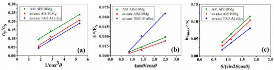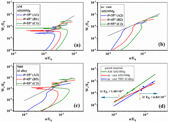 In order to compare the energy absorption behavior among the three strut materials, the energy absorption diagrams have been established based on the scale relationship between and in a logarithmic coordinate system, as shown by Figure 13a–d, in which is the Young’s modulus of strut material. According to the trajectory rule proposed by Maiti et al. [34], there is an optimal energy absorption point or shoulder point in the energy absorption diagram for each sample. Enveloping the points in different inclination angles for each sample will form a straight line. The slope of straight line and its intercept with coordinate axes indicate the energy absorption capacity of lattice structure in a certain stress level. Figure 13a–c separately show the envelope lines for the three alloy lattice structures with varied inclination angles, and Figure 13d is the summary of three envelope lines. It is seen from Figure 13d that the sample made of as-cast AlSi10Mg alloy shows the best energy absorption performance when . However, when stress level is over this value, the AM AlSi10Mg alloy lattice structure has the highest .