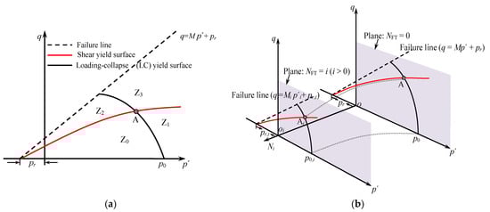 The deformation of soil slope after the F–T cycle, which includes the shear deformation, compression deformation, or a combination of the two deformations, is complicated. The double yield surfaces proposed by Yin (1988) [31] could reflect two types of plastic deformation mechanisms, namely, plastic volumetric compression and plastic shear for soils, and it is often employed by researchers [24,32] to present the mechanical and deformation characteristics of soils. Therefore, the double yield surfaces proposed by Yin (1988) [19] were used in this paper.