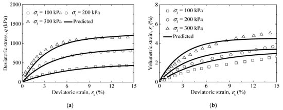 Comparison between predicted and observed results: (a) stress–strain curve, and (b) volumetric–deviatoric strain curve of bioenzyme-treated saturated soils (data from [37]).