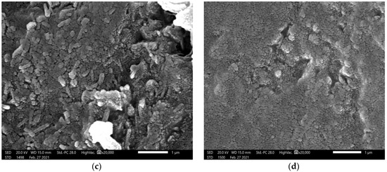 The scanning microscope images of (a) blank concrete sample, (b) concrete sample with bulk 5% of bismuth oxide sample, (c) concrete sample with 5% of nano-bismuth oxide sample, and (d) concrete sample with 10% of nano-bismuth oxide sample.