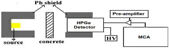 To reinforce this article, Monte Carlo Geant4 Simulation version 10.3.P3 was used. In the present work, the detector simulated at the x-plane with the same condition in the experimental work. At the top of the detector, the absorbed concrete sample was simulated. The thickness of the concrete sample was optimized according to the energy of the falling beam to avoid all photons being absorbed into the concrete sample or traversing the sample plate without reaction. The monoenergetic photons were simulated in this work to avoid the coincidence summing effect as well as to give us a broad range of energy from 0.015 up to 15 MeV [23,24,25,26]. The physical processes were considered, including photoelectric, Compton, and pair production interactions. The incident beam was designed as the narrow beam by using a lead collimator, as shown in Figure 2.