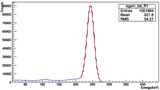 The simulated spectrum at 0.245 MeV using Geant4 code, where the blue spectrum is the original spectrum and the red spectrum due to the Gaussian fitted spectrum.