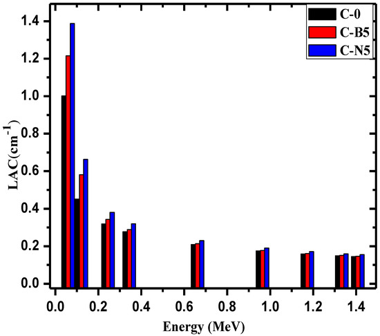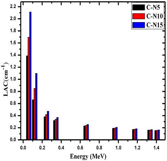 Figure 5 analyzes the influence of nanoparticle Bi2O3 on the LAC of the concretes. Samples with 5, 10, and 15% Bi2O3 were selected to observe the effect of increasing the nanoparticle Bi2O3 concentration on the shielding ability of the concretes. At all energies, the LAC values have the trend of C-N5 < C-N10 < C-N15. At 0.245 MeV, for instance, the LAC values increased from 0.381 to 0.418 and 0.472 cm−1 for C-N5, C-N10, and C-N15, respectively. These results demonstrate that increasing the amount of nanoparticle Bi2O3 improves the shielding ability of the concrete. Furthermore, the influence of Bi2O3 on the LAC values is clearer at low energies. For example, at 0.0595 MeV, C-N5′s LAC was 1.39 cm−1, C-N10′s LAC was 1.70 cm−1, and C-N15′s LAC was 2.11 cm−1. This trend can be understood according to the domination of photoelectric process. At higher energies, meanwhile, the effect of Bi2O3 on the shielding ability of the concretes is minimal, and the difference between their capabilities of the samples is small. This is a result of the domination of Compton scattering which has a weak dependence on the chemical composition of the medium. The LAC values at 1.41 MeV are equal to 0.155, 0.158, and 0.164 cm−1 for C-N5, C-N10, and C-N15, respectively. Nevertheless, at all energies, the C-N15 sample had the greatest LAC out of these three samples.