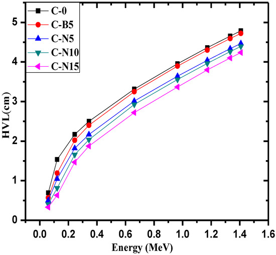 The half-value layer (HVL) is an important radiation shielding parameter [36,37,38,39]. The HVL for C-0, C-B5, C-N5, C-N10, and C-N15 is illustrated in Figure 6. At all energies, the C-0 has the greatest HVL at all energies, while C-N15 has the least. For example, at 0.0595 MeV, C-0 has an HVL of 0.683 cm while C-N15 has an HVL of 0.328 cm, while at 1.41 MeV. the HVL values are equal to 4.68 and 4.24 cm for C-0 and C-N15, respectively. Since the C-N15 sample has the least HVL at all energies, this concrete is the most space efficient, while C-0 is the least space efficient. Moreover, when comparing C-B5 and C-N5, which both have the weight fraction of Bi2O3, it can be seen that the HVL for the concrete with NP Bi2O3 is lower than that of bulk Bi2O3, which means that the use of NPs decreases the thickness of the concretes and improves their ability to shield photons.