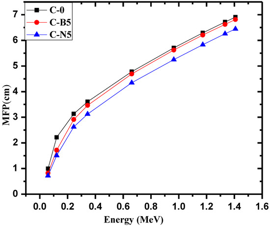 The mean free path (MFP) for the C-0, C-B5, and C-N5 concretes are illustrated against increasing energy in Figure 7. At all energies, MFP increases with increasing energy. This means that the ability of the photons to penetrate the samples under study increases with increasing the energy. The MFP of the C-0, for example, increases from 0.986 cm at 0.0595 MeV to 3.06 cm 0.245 MeV, 4.78 cm at 0.662 MeV, 6.25 cm at 1.17 MeV, and 6.76 cm at 1.41 MeV. For the C-N5 sample, the MFP is equal to 0.721, 2.62, 4.35, 5.83, and 6.44 cm for the same respective energies. This increasing trend occurs because higher energy photons have an easier time penetrating through the samples, decreasing the number of collisions, and increasing the distance between collisions, increasing MFP. Another trend can be observed when analyzing the values at a single energy. At 0.662 MeV, for example, the MFP values are equal to 4.78, 5.07, and 5.25 cm for C-0, C-B5, and C-N5, respectively. This trend occurs at all energies and demonstrates that the C-N5 sample has the best shielding ability out of these three concretes.