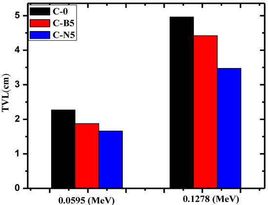 Figure 8 graphs the tenth-value layer (TVL) at 0.0595 and 0.1278 MeV for C-0, C-B5, and C-N5. At both 0.0595 and 0.1278 MeV, the TVL follows the order of C-0 > C-B5 > C-N5. More specifically, at 0.0595 MeV, they are equal to 2.27, 1.88, and 1.66 cm for C-0, C-B5, C-N5, respectively, and at 0.1278 MeV, they are equal to 4.96, 4.42, and 3.47 cm for the same respective concretes. These results show that the TVL for blank concrete is higher than for 5% bulk Bi2O3 and 5% NP Bi2O3, with the NP Bi2O3 having the lowest TVL at both energies. It was also found that this trend is maintained at all the tested energies; thus, only these two energies were graphed. Figure 8 also shows that TVL increases with increasing energy, which agrees with the trend in the HVL figure.