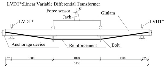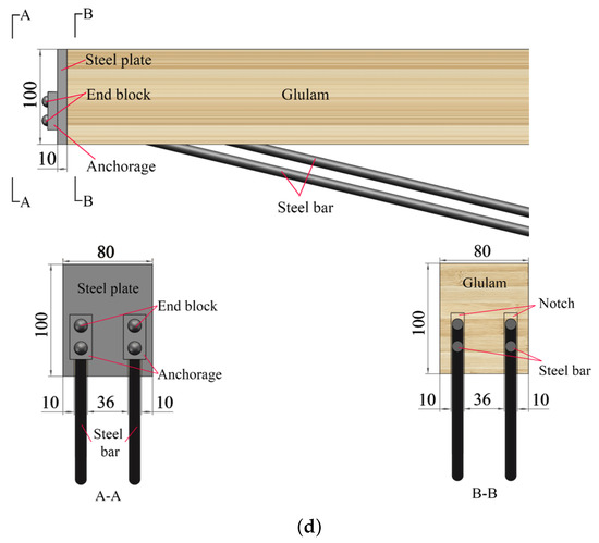 As shown in Figure 1, the prestressed beam is composed of a Glulam beam, anchorage device, reinforcement, and bolt. Figure 2 presents the diagram of screw bolt composition. All dimensions are in mm, similarly hereinafter.