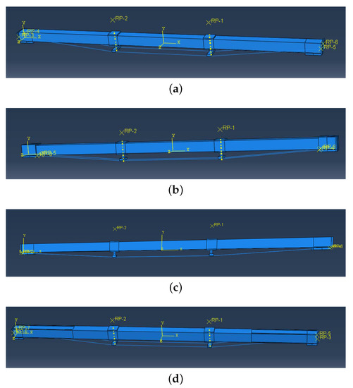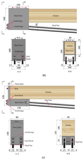 Figure 8 shows the prestressed beams models with four types of various anchorage devices. The surface-to-surface contact was employed to model the interaction between the Glulam and the steel devices, including steel plates and anchorage devices. The former and the latter were defined as the slave surface and master surface, respectively. As there should not be any delamination between anchorage devices and the beams, the laminations were tied. Top prestress and upward pre-deflection were applied to the beams by extending the bolt.