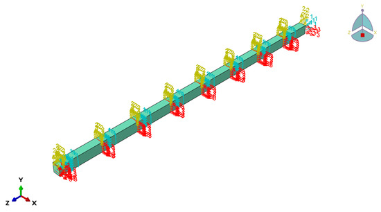 The Glulam was modeled as anisotropic, and all anchorage devices, screw bolt compositions, and steel bars were modeled as isotropic. First, we built and assembled the parts of the model. Next, the load was applied after the bolt was extended. This simulation included the related prestress and stress state. Subsequently, the bending behavior of prestressed beams was modeled in the quasi-static time-independent domain.