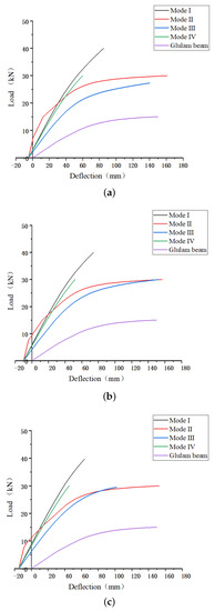 Keeping consistent top pre-deflection, control the initial mid-span deflection was 5 mm, 10 mm, and 15 mm, respectively. As is shown in Figure 9, as the initial mid-span deflection increased, the bending capacities of all prestressed beams had certainly improved, and initial deflection is defined as negative deflection. Meanwhile, the stiffness showed significant improvement. Compared with the same size of Glulam beams, the capacity of all prestressed Glulam beams was improved. Within the scope of regulation, the prestressed beams with mode I anchorage device keep the largest bending capacity under the same top deflection. Compared with the other three forms of the prestressed beam, with the initial top deflection increasing, the bending capacity of the prestress beam gets the most significant improvement, but that was still lower than other forms of prestressed beams. At the elastic stage, the stiffness of the beam with mode II anchorage device was the highest, but at a later stage, its stiffness showed a pronounced decline, this kind of beam shows more plasticity. This is because the iron bolt can improve the stiffness initially. Still, with the load increasing, the steel bar could not produce relatively high stress, and the stress concentration could be found in the interface between the iron bolt and beam end.